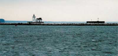This photograph by Bruce Robie shows the Cleveland West Breakwater Lighthouse to the left and only a platform and a temporary light where the Cleveland East Pierhead Light used to stand. Back to the edition of: December 2005