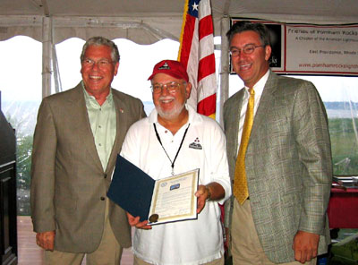 Rhode Island Governor Donald Carcieri and East Providence Mayor Joseph Larisa flank Don Doucette, chairman of the Friends of Pomham Rocks Lighthouse at the re-lighting ceremony. Photo courtesy of Laura McNamara. Back to the edition of: October 2006