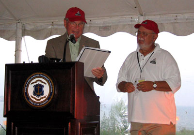 Rhode Island Governor Donald Carcieri, wearing the red volunteer hat of the Friends of Pomham Rocks Lighthouse, reads the Rhode Island Proclamation as Don Doucette, chairman of the Friends of Pomham Rocks Lighthouse, a chapter of the American Lighthouse Foundation, looks on ready to accept it. Photo courtesy of Ann Trapani. Back to the edition of: October 2006