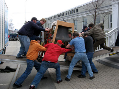 Movers unloading an extremely heavy lightship fog bell as it is about to enter its new home at the Maine Lighthouse Museum in Rockland, Maine. Back to the edition of: June 2007