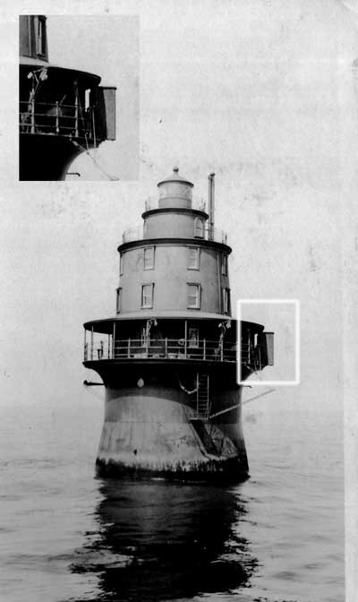 As with many other lighthouses of this style, the privy at Miah Maul Lighthouse, hung over the side railing in this 1925 photograph. The lighthouse was built in 1913 at center of Delaware Bay near Downe, NJ and was automated in 1974. Back to the edition of: November 2008
