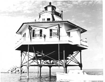 The people in the boat were taking a chance underneath the privy at Sharkfin Shoal Lighthouse in 1972. Perhaps they saw the keeper standing at the railing and knew the privy was not in use. The Sharkfin Shoal Lighthouse was established in 1892 and stood in the Chesapeake Bay, Maryland. It no longer stands. Back to the edition of: November 2008