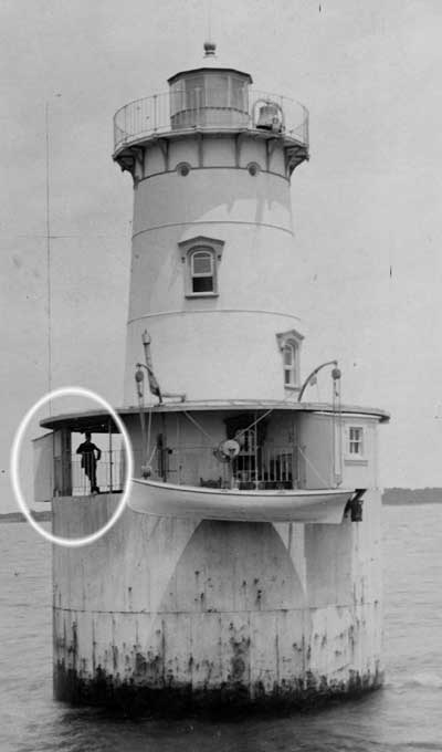 Leaning on the railing, the lighthouse keeper at Maryland’s Bloody Point Lighthouse appears to be waiting for his turn to use the station’s privy, which sticks out from the station’s walkway over the Upper Chesapeake Bay near Claiborn, Maryland. Approximately three years ago, under the National Lighthouse Preservation Act, the lighthouse was purchased at auction by a Nevada resident for $100,000. Major Jared A. Smith of the Army Corps of Engineers took this photograph on July 3, 1885.