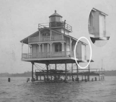 Although the privy jutted out over the water, being attached to the structure, the keeper did not have to venture outdoors at the Volusia Bar Lighthouse that was established in 1886 at the entrance to the St. Johns River near DeLand, Florida. Although the light from the tower was discontinued in 1916, it remained as an active fog signal and a keeper remained on duty until 1963. In 1938 the U.S. Lighthouse Service keeper stationed here was murdered and the lighthouse was ransacked. The crime was never solved. In the 1974 a fire set by vandals destroyed the structure.