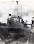 This rare photograph of the Umatilla Lightship, taken on February 3, 1946, shows the vessel painted with the letters L.S. 88 on its bow. The vessel was in the yard of the Lake Union Dry Dock Company being made ready to return to lightship duty after being taken over by the U.S. Navy during World War II when she was stationed off the Strait of Juan de Fuca as an observation and patrol vessel. At the time this photo was taken, the three-inch 23 caliber gun, the three anti-aircraft guns, and the depth charge equipment, which had been installed for wartime, was being removed from the ship. Notice the long stairs going up and the plank used to board the vessel. Flying from the bow of the ship is a 48 star Navy Union Jack flag.