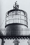 Shown here in 1920 atop the lantern of Oregon’s Tillamook Rock Lighthouse are (l-r) lighthouse keepers Raymond Bay, Howard L. Hansen, and Orlo E. Hayward. The photo was taken by lighthouse keeper Walter T. Lawrence.