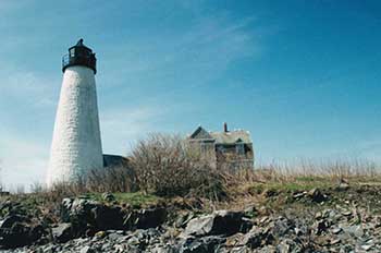 Other Buildings? 1857 two story wood keeper's house, 1903 oil house, storage building. Earlier Towers? 1808: 45-foot octagonal pyramidal wooden tower. 1839: 45-foot conical granite tower. Date Established: 1808 Date Present Tower Built: 1858 Date Automated: 1986 Optics: 1858: Fourth order Fresnel lens; 1972: rotating aerobeacon; now VRB-25. Fog Signal: Fog bell in pyramidal tower (bell is now on display at Vine's Landing in Biddeford Pool); now automated horn with two blasts every 30 seconds. Current Use: Active aid to navigation. Open To Public? No. Directions: North or south on ME 9: Turn onto ME 208 (Bridge Road). At a T-intersection turn left. Continue through Biddeford. Just before the road turns right into Ocean Avenue, there is a closed vehicular gate on the left. Off-road parking is permitted near the gate. Walk through the pedestrian entry to a path. The path leads to the shore; the lighthouse can be seen after a 0.3 mile walk, some of which is slightly uphill and rocky. Bring your binoculars; the view is fairly distant. Listed on the