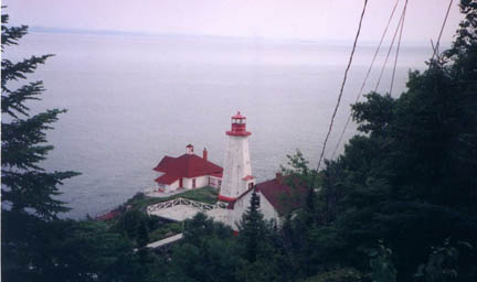 Notes: This station, except the lighthouse itself which is still owned by the Canadian Coast Guard, is now leased to the Corporation du Phare de Cap-au-Saumon, and the station is being gradually restored. Access to the station has been improved, but visitors must still enter on foot and are not allowed to drive down the steep path. Tower Height: 46 Height of Focal Plane: 82 Characteristic and Range: Three white flashes every 15 seconds; range 20 nautical miles. Description of Tower: White octagonal tower with red lantern.