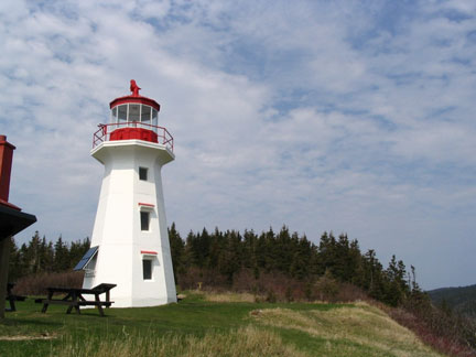 Earlier Towers? 1873: 30-foot tall square tower with dwelling attached; destroyed by fire in 1890. 1892: 46-foot tall square tower rising from the roof of the keeper's dwelling. Date Established: 1873 Date Present Tower Built: 1950 Date Automated: 1972 Current Use: Active aid to navigation. Open To Public? Grounds only. Directions: The lighthouse is located in Forillon National Park, which is primarily used by hikers and campers. From the town of Gaspé, follow Highway 132 Ouest to the village of Cap-aux-Os. About a mile past the village, follow signs for “Forillon - South Area” to the entrance gate (admission fee in 2002: $4.00/day). The way to the lighthouse begins at the end of the road, about 3 miles past the gate. Limited parking available. Two different itineraries are possible: a 2.5-mile long hiking path, which should be attempted only by experienced hikers; and an unpaved road, which is more direct (approx. 1.5 miles) but still pretty tough: the last stretch (2000 ft) before reaching the lighthouse is a long uphill climb. Both the path and the old road provide breathtaking views over Gaspé Bay. (Thanks to Michel Forand.) Keepers: Charles Esnouf (1873-?), Eylmer Langlois (1959-1972)