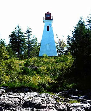 Notes: This light operates on a point to point system with the Sand Point Light. In June of 2017 a fire destroyed the 1896 tower. A new lighthouse was built in 2018 by the Canadian Coast Guard. Tower Height: 46 Height of Focal Plane: 92 Characteristic and Range: Green flash every 12 seconds; visible for 7 miles. Description of Tower: White, square, pyramidal wooden tower with a red lantern.