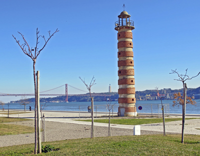 Notes: Though only a faux lighthouse, the area around Doca de Bom Sucesso Light was incredibly photogenic. On one side of the light is the impressive Monument to the Discoveries. The monument celebrates the Portuguese Age of Discovery during the 15th and 16th centuries. A short walk along the sea from the other side of the lighthouse is the 16th century Belém Tower. Torre de Belém was commissioned by King John II to be part of a defense system at the mouth of the Tagus River and a ceremonial gateway to Lisbon (it once hosted a skeletal lighthouse). Across the river from the lighthouse is the stunning Cristo-Rei, a Christ the King statue that towers nearly 800 feet above the sea. Even the "25 de April Bridge" (Golden Gate Bridge of Lisbon"), suspended above the bay and stretching out for nearly a mile and a half is quite awe-inspiring. Description of Tower: Cylindrical concrete tower with orange and white bands.
