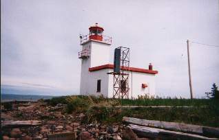 Earlier Towers? 1868: Lantern on roof of dwelling. Date Established: 1868 Date Present Tower Built: c. 1971 Current Use: Active aid to navigation. Open To Public? Grounds only. Directions: From Pictou: Take Highway 6 at the Pictou Rotary towards River John. Turn right after about four miles at Three Brooks. Follow this road for aproximately 2.5 miles. Just before Central Caribou you will turn left onto the shore road. Travel the shore road for two miles until you come to Waterside. When you reach Waterside, follow the signs for the Provincial Park and turn right towards the shore. There is a parking area here at the park and outhouses. You can then continue through the parking area eventually turning left onto the road that runs the length of the island. The lighthouse is at the other end of the island. From Bob Crawford: "This is a great spot to view the ships to and from PEI/NS...very peaceful and quiet." Keepers: Walter Richards