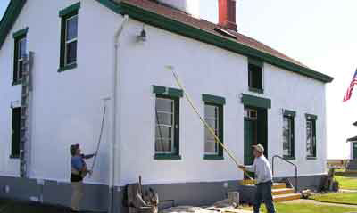 Volunteers, Barry Dove and Bill Bjorklund, painting the tower building at New Dungeness Lighthouse.