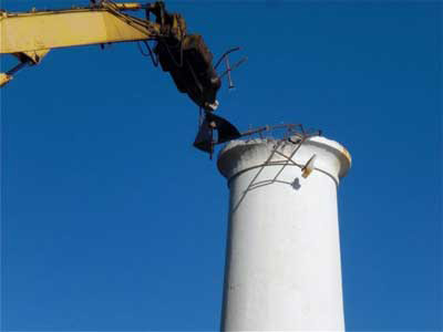 The wrecking crane begins the destruction of the Kauhola Point Lighthouse in 2009. (Photograph courtesy Hawaii24/7.org by Marci Elizondo of www.LighthouseLiquorsHI.com) Back to the edition of: March 2010