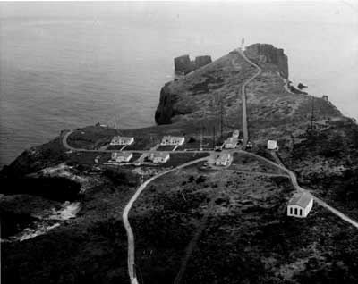 Anacapa Island Lighthouse Station, California as it appeared in 1932 shortly after its completion. The lighthouse personnel stationed here, when not working, occupied their spare time fishing, hunting rabbits, playing board games, and having fun simply exploring the island’s many nooks and crevices. For many years their only contact with the outside world was the radio. Television did not arrive on the island until 1951. (Bureau of Lighthouses photo, Lighthouse Digest archives.)