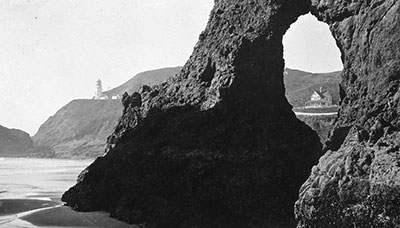 The “Needle’s Eye” was an unusual rock formation down the beach from Heceta Head Lighthouse that proved to be a fun photo frame for pictures. This one shows the head keeper’s house through the hole in the needle. Both are no longer there. The keeper’s house was razed in 1940 and the needle has long since disappeared due to erosion from the ocean waves. (Photo courtesy of Brian Bay.) Back to the edition of: Jan/Feb 2017