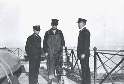 Raymond Bay, Orlo Hayward and Howard Hansen examine the one day lens lantern that they would use for a back-up light in case of problems with the main beacon. (Photo courtesy of Coast Guard Museum NW.) Back to the edition of: Jan/Feb 2017