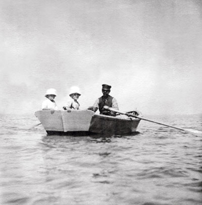 (l-r) Daughter Anna, wife Meta, and keeper John P. Kofod go for a leisurely boat ride at East Brother Light Station, California c.1914. Kofod was head keeper there for seven years following his service with Herbert Luff at Yerba Buena Lighthouse. (Courtesy Fanning Family Collection.)