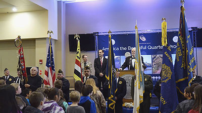 The Red Cliff VFW presented the colors at the opening of the ceremonial release of the Apostle Islands quarter. ((U.S. Mint photo by Tracy Scelzo Chaavez.) Back to the edition of: May/Jun 2018