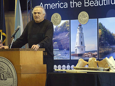 Henry Buffalo, a Red Cliff elder, addresses the crowd at the ceremonial release of the Apostle Island quarter. The lighthouse shown on the display behind him is the 1915 Ashland Breakwater Lighthouse in Ashland, Wisconsin, which is now owned by the Apostle Islands National Lakeshore. (U.S. Mint photo by Sharon McPike.) Back to the edition of: May/Jun 2018