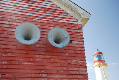 The old air chime fog horns at Cape Race Lighthouse in Newfoundland, Canada. It is interesting to note that, with two teams of two keepers on duty at this lighthouse, that the historic fog signal building is in such poor shape. Back to the edition of: August 2010