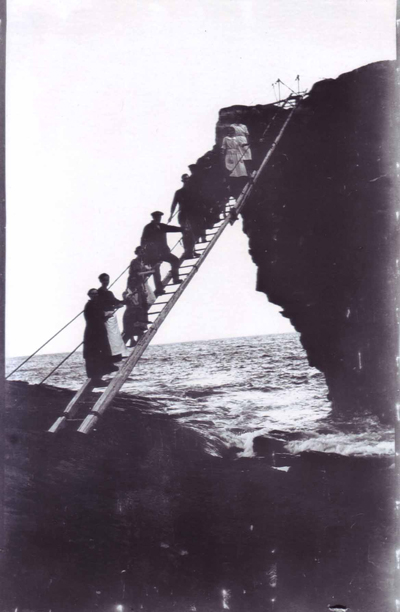 The lighthouse keeper’s family and others climbing up the ladder on Motion Island, where the lighthouse is, to the top of what was called “Wedge Rock.” They may have been on their way to a picnic, which was a favorite family outing. They may have also been on their way to church. Once at the top of Wedge Rock, they still had a two hour climb and walk to the church in Deer Harbour. (Photograph courtesy Elizabeth (Cooper) Bustard.) Back to the edition of: November 2010