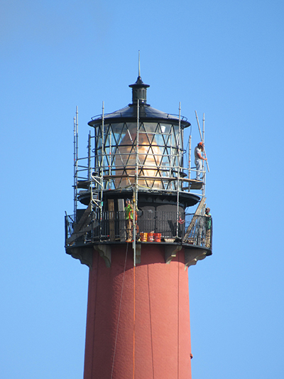 Workers from Razorback, LLC hoisting scaffolding. Notice that the lens is covered to protect it when work to the lantern was being done. (Courtesy Loxahatchee River Historical Society) Back to the edition of: Jan/Feb 2020