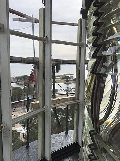 The view from inside of the lantern looking out past the 1st order Fresnel lens at the renovation work that was being done on the lantern at Currituck Beach Lighthouse. Back to the edition of: May/Jun 2020