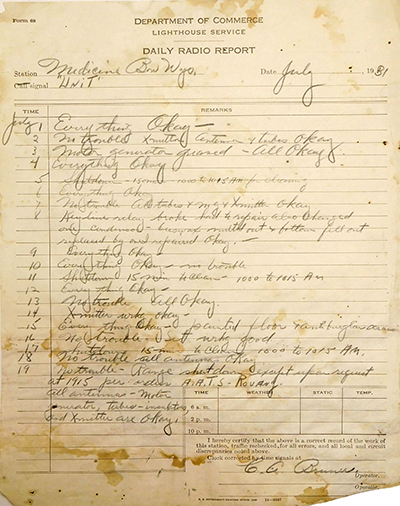 Amazingly, at a visit to Site 32 in 2019, this July 1931 U.S. Lighthouse Service radio log page was found in the derelict office building lying in the far recesses of a wall cupboard where it has sat for the past almost 90 years! The log was signed by C.A. Brunner, who was the station’s principal keeper and Edwin Cruickshank’s supervisor at the time. Back to the edition of: May/Jun 2020