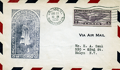 Special imprinted airmail envelope of the Lindbergh Beacon with a five-cent airmail postage stamp postmarked on August 27, 1930, the first day of its lighting. Back to the edition of: May/Jun 2020
