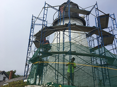 Work crew attaching protective netting around the Burnt Island Lighthouse for its restoration. Back to the edition of: Sep/Oct 2020