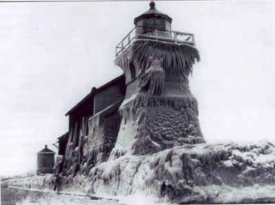 The Rochester Harbor West Pierhead Lighthouse covered in ice. Codding was stranded in the lighthouse during this storm. Running out of fuel, Codding was forced to rip up the floorboards of the house to burn them for warmth. The lighthouse was also known as the Charlotte-Genesee West Pierhead Lighthouse and the Genesee West Pierhead Lighthouse. (photograph courtesy Rochester Museum and Science Center.) Back to the edition of: Jan/Feb 2011