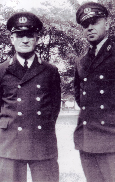 George Codding (l), a 44-year veteran lighthouse keeper, served as the keeper of the Rochester Harbor lighthouses for nearly 27 years. Before coming to Genesee, he served as a keeper at the Ashtabula Lighthouse in Ohio and the South Buffalo Lighthouse in New York. Shown with him is Wilbur Folwell, the assistant keeper in Rochester from 1933 to 1940. On January 1, 1940, upon George Codding’s retirement, Folwell became the Head Keeper and served in that position until 1947. (Photograph courtesy of June & Paul Codding.) Back to the edition of: Jan/Feb 2011