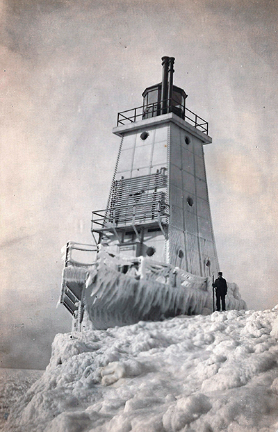 Fred took this icy photo of one of his assistants next to the “new” Ludington North Breakwater Lighthouse that was built in 1924. The lighthouse is still standing today and open to visitors seasonally. (Courtesy of Maribeth Schmock Runyan) Back to the edition of: Sep/Oct 2021
