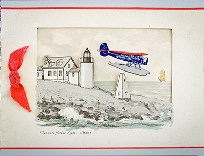 In 1935, the year the three men bought Tenants Harbor Lighthouse, Adriel Bird sent this innovative Christmas card out to all his friends and associates proudly showing off his new lighthouse purchase with a La Touraine Coffee plane flying overhead. Samuel Bickford’s grandson, Jeffrey, reports that Samuel had received an exact model of the red and blue plane, presumably a gift from Adriel Bird. “That small model was poised as in flight on a base made from one of the engine pistons of that aircraft. Its history is engraved on the piston,” Jeff wrote. (Courtesy of William H. Wincapaw III) Back to the edition of: Jan/Feb 2022