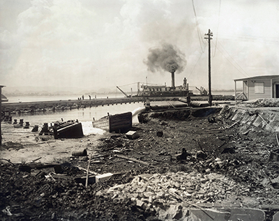 The original caption for this January 30, 1924 photo was: “Concrete bulkhead wharf commencing hydraulic filling operations.” In the distance, the “monster” United States Engineer suction dredge’s 20-inch diameter discharge pipe is seen smoking away. (National Archives) Back to the edition of: Jul/Aug 2022