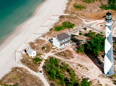 Aerial view of North Carolina’s Cape Lookout Light Station, taken a number of years ago when high water was still a distance away, which is no longer true today. Back to the edition of: Nov/Dec 2022