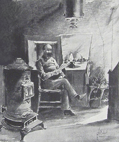 Left page: Looking like Santa reading some children’s Christmas letters while seated before a warm, cozy stove, this illustration, taken from a teaching journal around 1903, shows head keeper Milton R. Reamy in the watch room at Minot’s Ledge Light. There were many ghost stories told concerning the two keepers who died when the first tower collapsed in 1851. One of these was told by Gustav Kobbe in his 1894 Outlook magazine article: