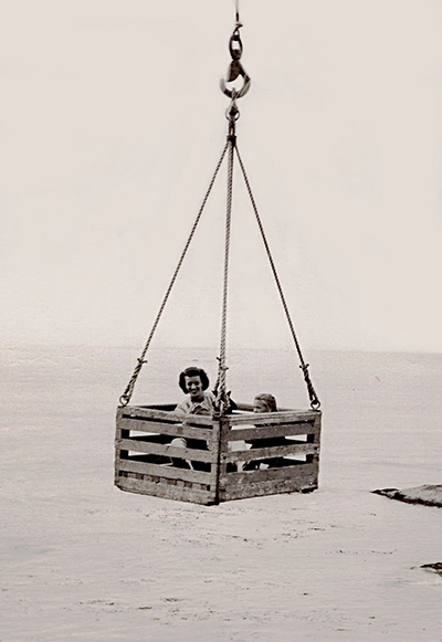 Keeper Art Shaffer’s wife, Olive, and her two young daughters, Donna and Kathryn, are riding in a similarly constructed derrick box at Cape Flattery Lighthouse in Washington in 1949. This photo demonstrates that women could safely undertake a trip in the box without too much difficulty, if they had the nerve. (Donna Shaffer Shinney Collection, Lighthouse Digest archives) Back to the edition of: Jul/Aug 2023