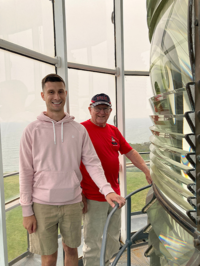 Alex Dias, Vice Chair of the Friends of Pomham Rocks Lighthouse, a chapter of the American Lighthouse Foundation, and David Kelleher, historian, in the lantern by the magnificent 1st order Fresnel lens at Southeast Light on Block Island, Rhode Island, where Nathaniel Dodge served as the 1st assistant keeper from 1874 to 1882. David Kelleher is an original founding member of the Friends of Pomham Rocks Lighthouse, a group that Timothy Harrison helped form in 2004, which is the organization that has, since then, restored the lighthouse.