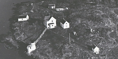 This vintage aerial photo shows the entire Squirrel Point Lighthouse Station on the Kennebec River in Maine. Although the date of the photo is unknown, it does show the chicken coop in the upper part of the photo, so it was likely taken during the time that Harold E. Seavey was the lighthouse keeper. (Lighthouse Digest archives.) Back to the edition of: Nov/Dec 2013