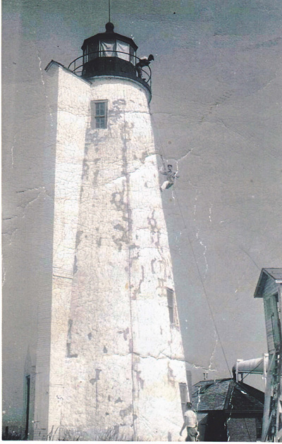 Lighthouse keeper Paul Baptiste is shown here hanging from the bosun’s chair while painting the Baker’s Island Lighthouse tower. Standing on the outer walkway of the lantern room is Coastguardsman Bob Wagner. Notice that the shades or curtains were drawn in the lantern room to protect the lens from the harmful rays of the sun. Paul Baptiste served at Baker’s Island from 1946 to 1951. Back to the edition of: Nov/Dec 2014