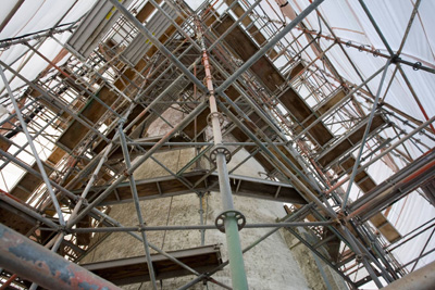 A dramatic view inside the scaffolding and wraps, looking up at the tower. Back to the edition of: Jan/Feb 2015