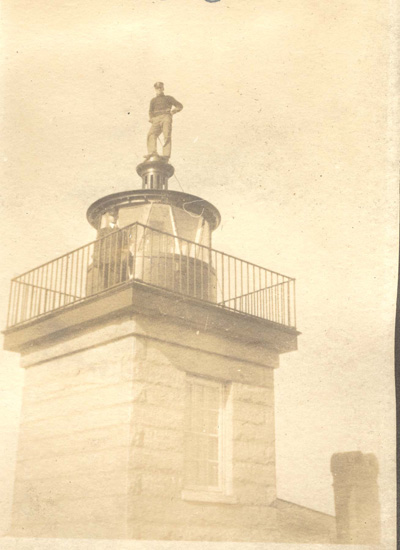 One of the keepers standing atop the vent ball on the lantern room at Watch Hill. This was highly unusual and is the first time that I have seen such antics by a lighthouse keeper. Look closely and you will another keeper on the outer walkway. Back to the edition of: May/Jun 2015
