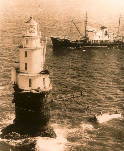 Mile Rock Lighthouse was also serviced by the lighthouse tender Willow. Crewmen like Bud Stevens had to carry supplies up a ladder hanging from a boom. (Lighthouse Digest archives.) Back to the edition of: May/Jun 2015
