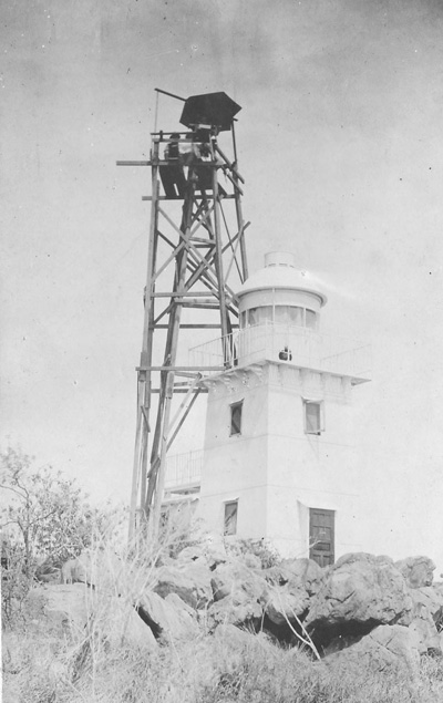 Apparently as early as 1918, as depicted in this photo, the government thought that for navigational purposes that the beacon should be much higher than the lighthouse when they erected this crude wooden tower next to the lighthouse. (Lighthouse Digest archives.) Back to the edition of: May/Jun 2015