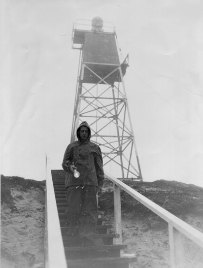 A lighthouse keeper dressed in foul weather gear at the third Point Arguello Lighthouse. (Lighthouse Digest archives.) Back to the edition of: Jan/Feb 2016