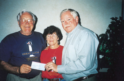 At the recent Great Lakes Lighthouse Festival held in Alpena, Michigan the Festival’s Sharing Program, which distributes funds to various Great Lakes lighthouses, received an extra boost from the American Lighthouse Foundation. Shown here is Tim Harrison (right), president of the American Lighthouse Foundation, presenting a check for $5000.00 to Marv and Joy Theut of the Great Lakes Lighthouse Festival. Including ALF’s donation the festival raised over $25,000 for the Sharing Program. Back to the edition of: December 2000