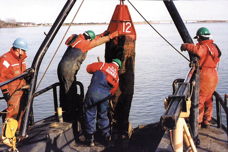 Bob Trapani is the center person on the bow of the buoy boat, scraping barnacles and mussels from the base of a buoy. Back to the edition of: June 2001