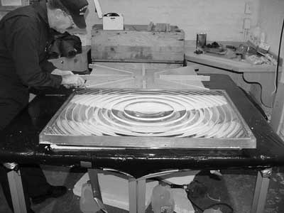 CWO Joe Cocking inspecting and working on bulls-eye panels of the Heceta Head Light lens. Back to the edition of: October 2001